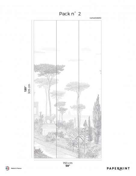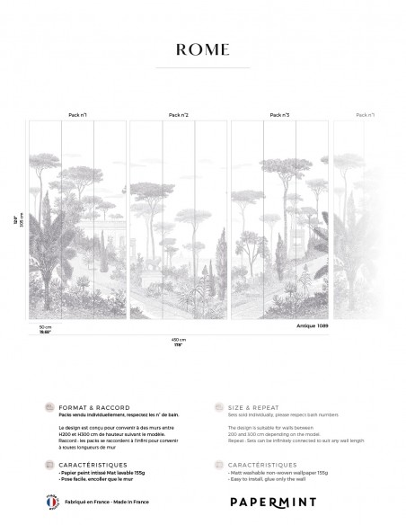 Dimension totale : Décor complet : L450 x H305cm • Pack de L150 x 305 cm (3 lés de Largeur 50cm) vendu individuellement