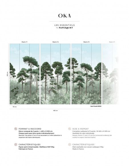 Dimension totale : Décor complet : L450 x H305cm • Pack de L150 x 305 cm (3 lés de Largeur 50cm) vendu individuellement