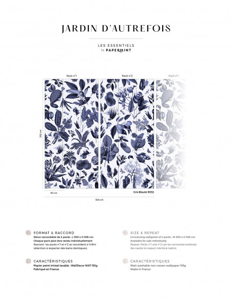 Dimension totale : Décor complet : L300 x H305cm • Pack de L150 x 305 cm (3 lés de Largeur 50cm) vendu individuellement
