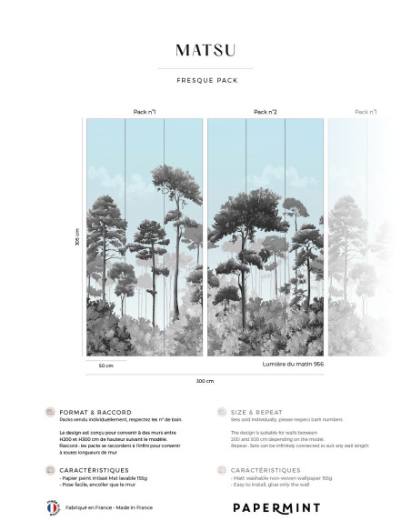 Dimension totale : Décor complet : L300 x H305cm • Pack de L150 x 305 cm (3 lés de Largeur 50cm) vendu individuellement