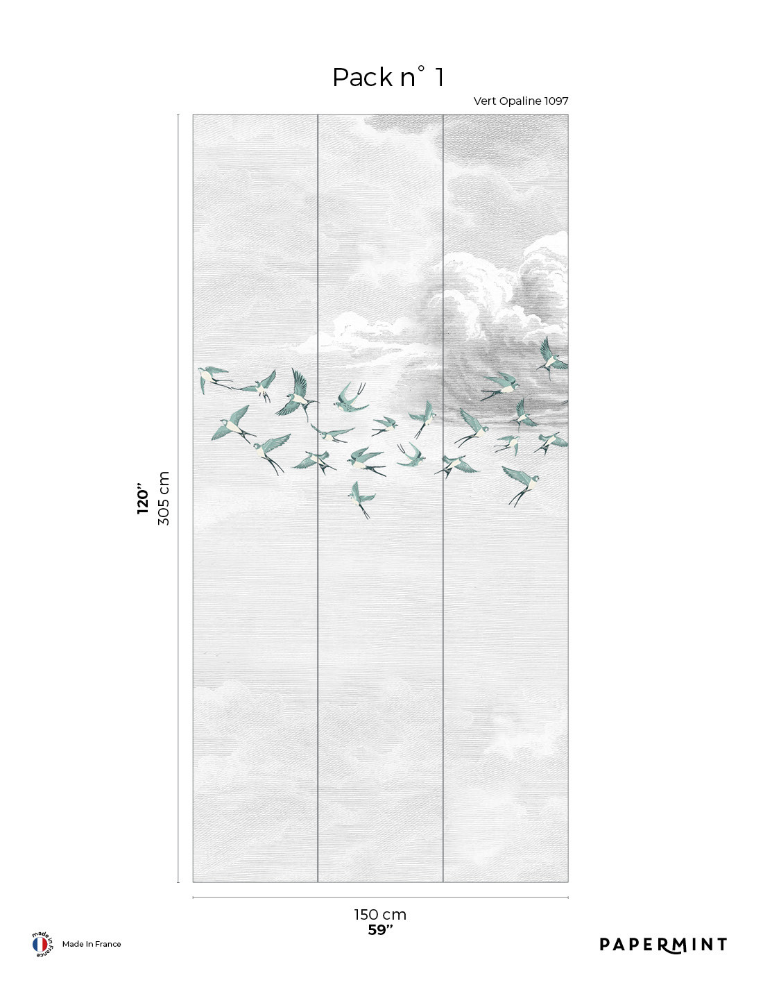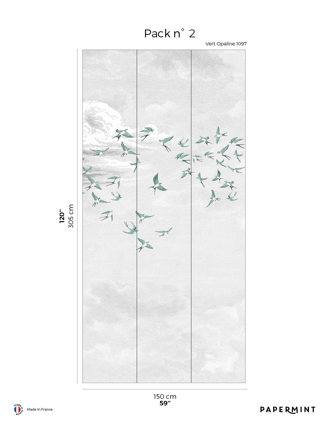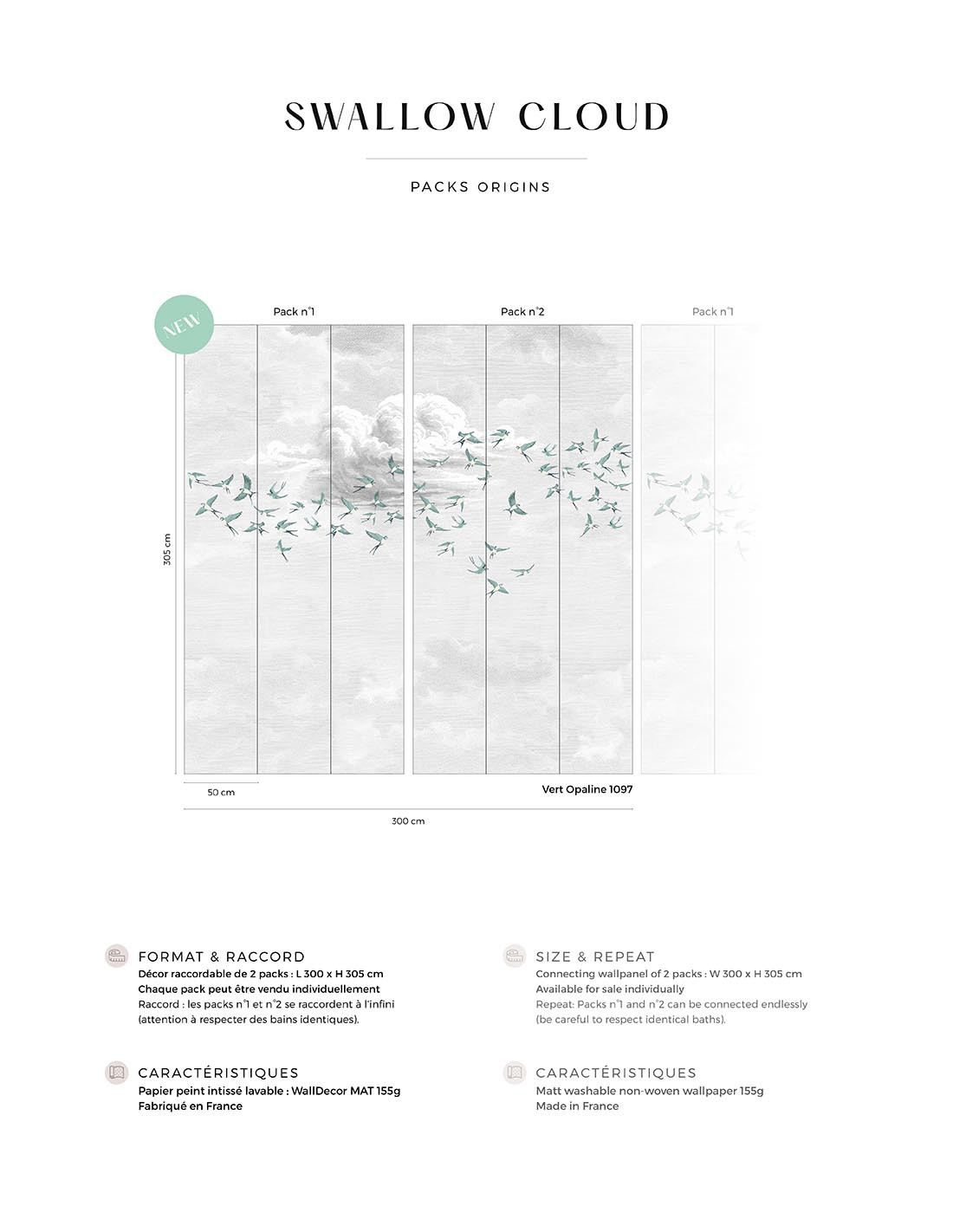 Dimension totale : Décor complet : L300 x H305cm • Pack de L150 x 305 cm (3 lés de Largeur 50cm) vendu individuellement