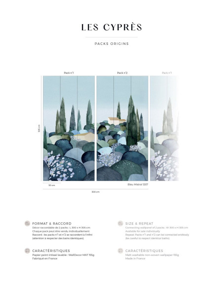 Dimension totale : Décor complet : L300 x H305cm • Pack de L150 x 305 cm (3 lés de Largeur 50cm) vendu individuellement