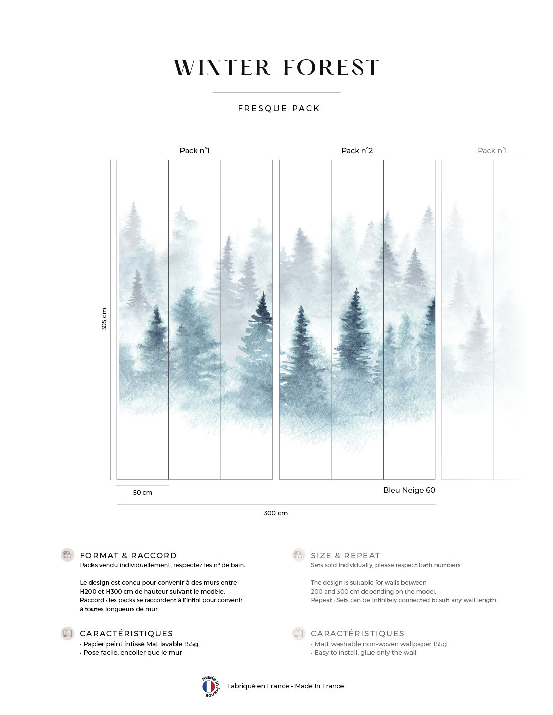 Décor complet : L300 x H305cm • Pack de L150 x 305 cm (3 lés de Largeur 50cm) vendu individuellement